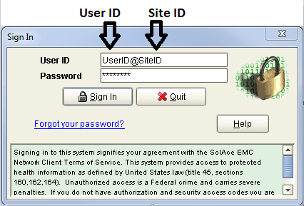 If you just installed a new copy of SolAce EMC Enterprise Edition at your office, the Site ID is default, User ID is admin, and Password is admin.